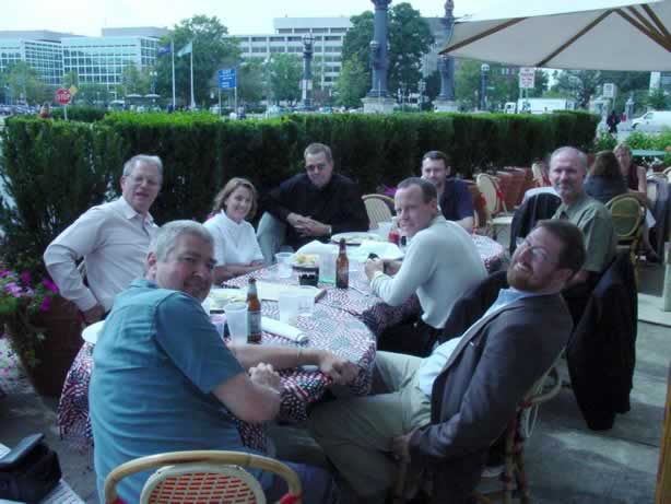 Lunch break during the conference: Philip Gibbs, Roger Wood, Julie Horvath, Van Husson, Stefan Riepl, Bud Donovan, Jack Stevens, Mark Davis (clockwise).